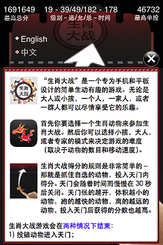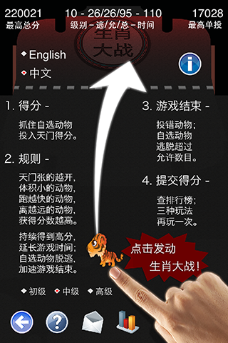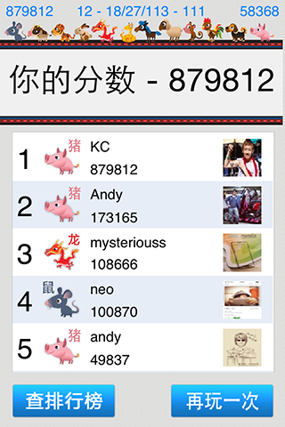 游戏结束后,你可以提交得分,查排行榜,和再玩一次游戏。生肖大战提供三种不同的排行榜。这也意味着生肖大战有三种不同的玩法。