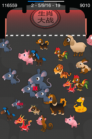2)脱逃的自选动物超过允许的数目。游戏一开始时,允许自选动物脱逃的数目设定为5生肖大战。每投入10个自选动物,就会升等一级并且多加一个允许脱逃自选动的数目以及升高天门并增加10秒钟天门关闭的时间。另外在随机的状况下会有在背上贴着红色XX和XXXX的自选动物出现。抓住这些动物并把它们投入天门将获得两倍和四倍的分数以及多加一个和两个允许脱逃自选动的数目和升高天门增加5秒和10秒天门关闭的时间。所以你需要尽你所能把这些背上贴着红字的自选动物投进天门来获取高分。