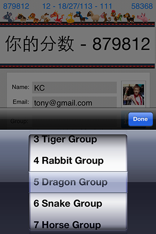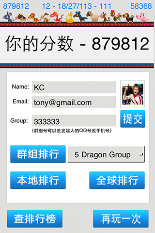 2)第二种玩法是第一种玩法再加上一群人大家都填入相同的群组号来提交得分。群组号可以是群组发起人的QQ号或手机号。这时你除了查看全球的排行榜,也可以选择一个群组号来查看群组的排行榜。你也可以选择一个生肖群组来查看这个生肖的排行榜。